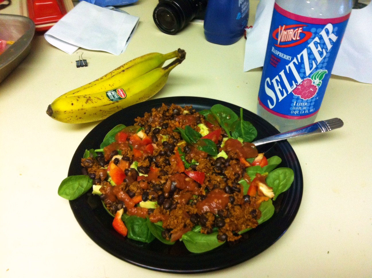 The Good: Salad time! Salads, I think, are just meant for warm weather. And, come spring time, I just wanna throw away my “comfort foods” and chow down on piles of fresh veggies, black beans, salsa, and greens! MMmmm.
